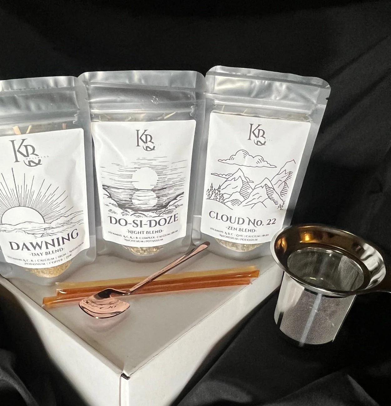 The Gather Trio gift set includes 3 premium herbal teas, your choice of tea infuser, a stainless steel teaspoon, and 3 honey sticks.